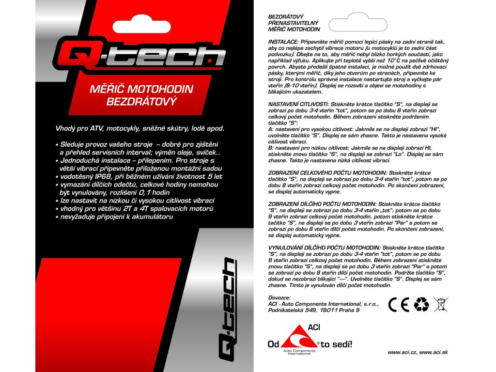 - sleduje provoz Vašeho stroje bez nutnosti montáže kabelu k zapalovací svíčce - funguje na principu přenosu vibrací od motoru - dobré pro zjištění a přehled servisních intervalů výměn oleje, svíček apod. - jednoduchá instalace přilepením nebo připevněním pomocí přiložené montážní sady - vodotěsný se stupněm krytí IP68 - možnost vymazání dílčích odečtů - lze nastavit nízkou či vysokou citlivost vibrací - vhodný pro většinu 2T a 4T spalovacích motorů - nevyžaduje připojení k akumulátoru - vhodný pro čtyřkolky, motocykly, sněžné skůtry, lodě apod. - rozměry D max x V x tl. = 6,5 x 3,2 x 1,2cm - kvůli dosáhnutí maximální vodotěsnosti není vnitřní baterie vyměnitelná, její životnost jsou 2 - 2,5 rokuAdditional parameters