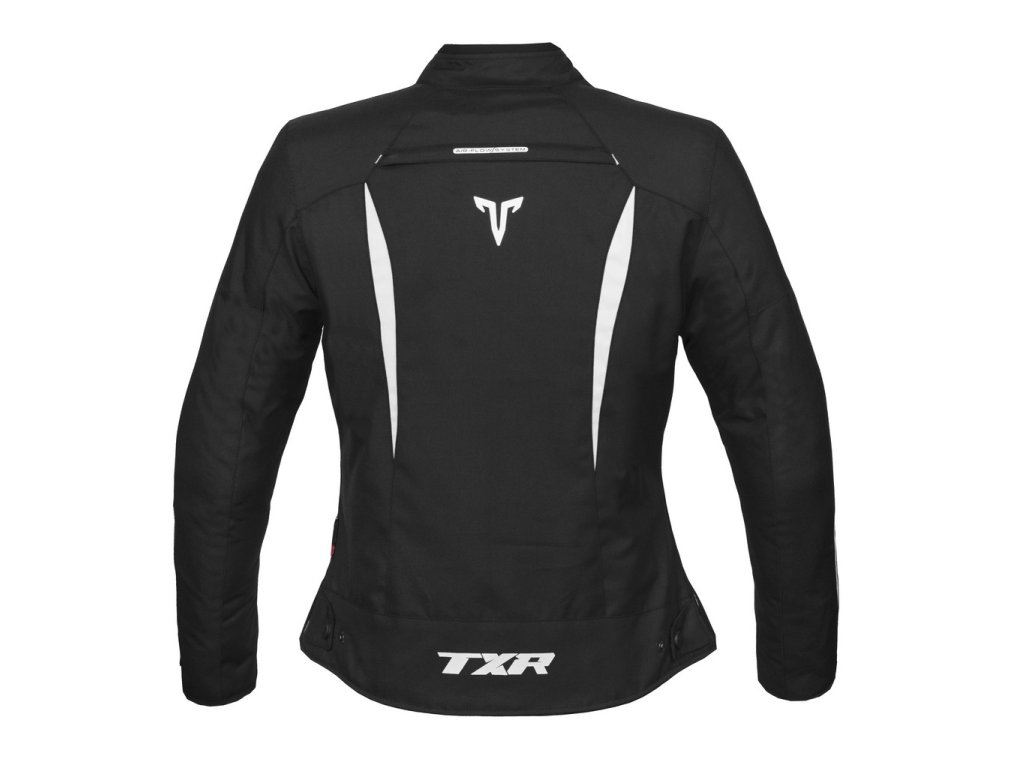 Dámská moto bunda TXR Elisa černo/bílá s jejím vrchním materiálem z Polyester Textech 600D, který je velice vhodný pro použití u motorkářských bund díky svým oděru odolným vlastnostem. Součástí je termo prošívaná podšívka, která je odnímatelná zipem. Bunda má i odnímatelné homologované chrániče loktů a ramen CE Level 1. Součastně má i přípravu pro vložení zádového chrániče, který není součástí balení, ale můžete ho koupit. Doporučujeme model TXR SW-253 vel. S.