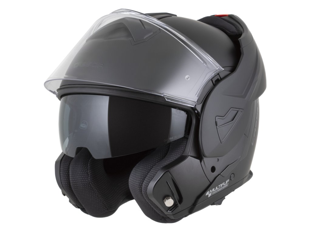 - Dvojí homologace ECE 22.06.P/J pro otevřenou a integrální přilbu s možností fixace výklopné části ve vyklopené poloze pomocí pojistky.